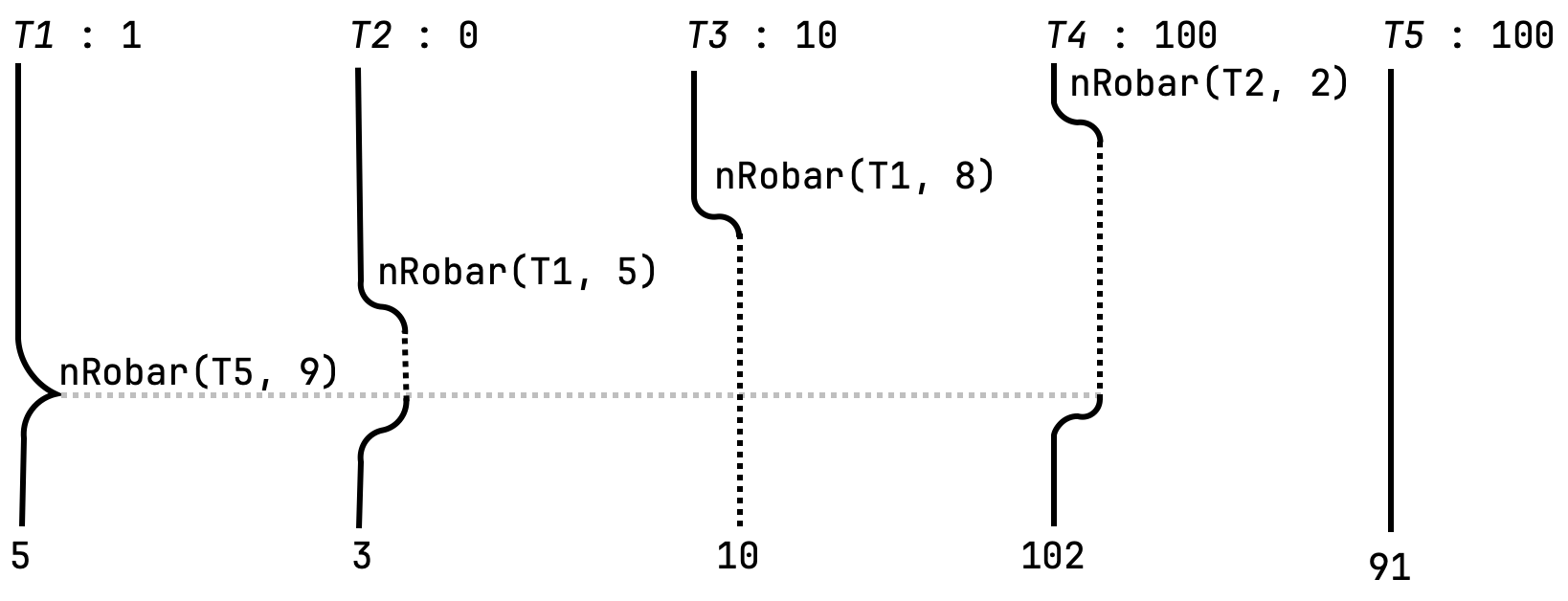 El segundo invariante es que en un instante dado el core \(T\) no puede estar esperando robarle \(c\) euros al core \(U\) si \(U\) tiene al menos \(c\) euros. Observe que cuando el core \(T\) lograr robar dinero, varios otros cores pueden estar esperando poder robarle dinero a \(T\). No está especificado en qué orden deben robarle el dinero a \(T\).